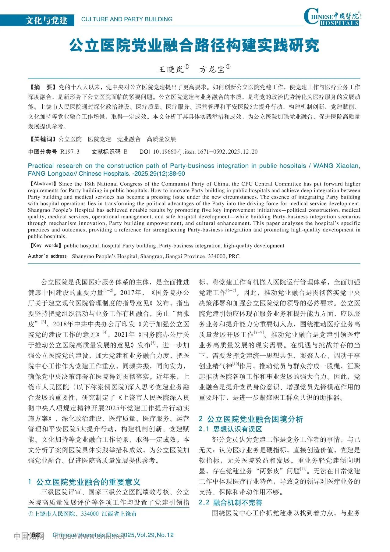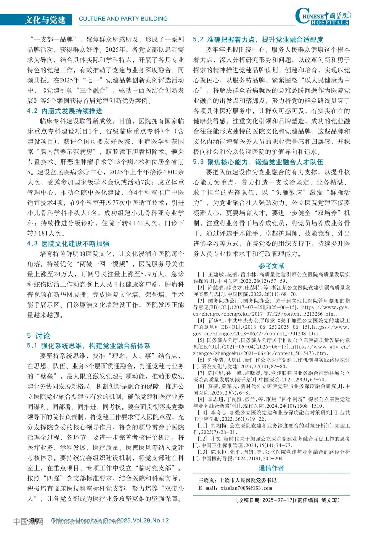 转发 | 《中国医院》杂志刊发我院文化与党建方面论文《公立医院党业融合路径构建实践研究》