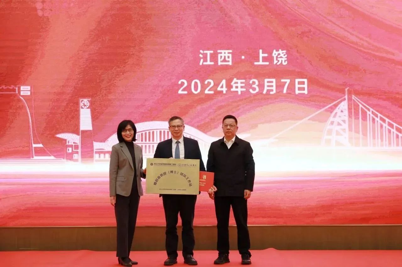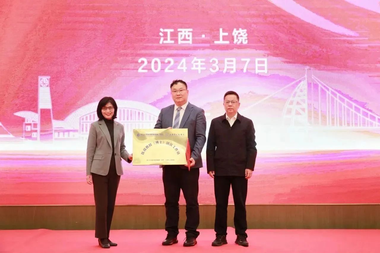 祝美清、王伟林共同向上饶市人民医院授予“浙江大学医学院附属第二医院——上饶市人民医院协作共建医院”,上饶市人民医院党委书记王晓岚接牌。俞文强、王晓岚共同为浙大二院教授王伟林、陈高、蔡明、袁瑛、魏启春、邹泓、蒋峻博士团队工作站颁发聘书。