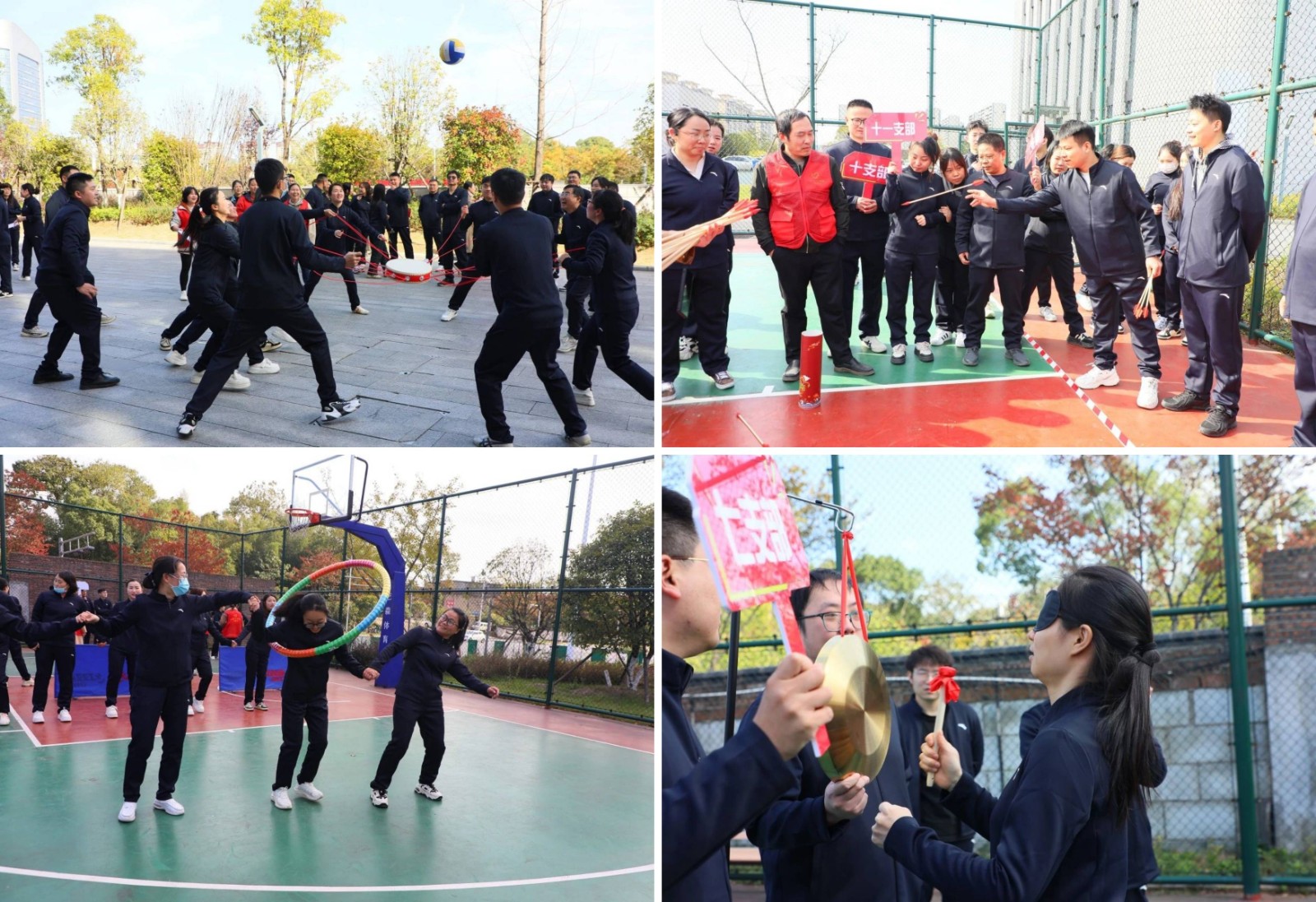 本次趣味运动会共有五个趣味项目,分别是传递呼啦圈、蒙眼敲锣、不倒森林、同心鼓、丢沙包,整个活动过程中, 处处都体现着团结和欢乐的氛围。没有参加比赛的职工们自发组成啦啦队,为参赛队员们加油助威,成为了运动会上一道亮丽的风景线。而参赛队员们在比赛间隙也相互交流经验,分享欢笑。